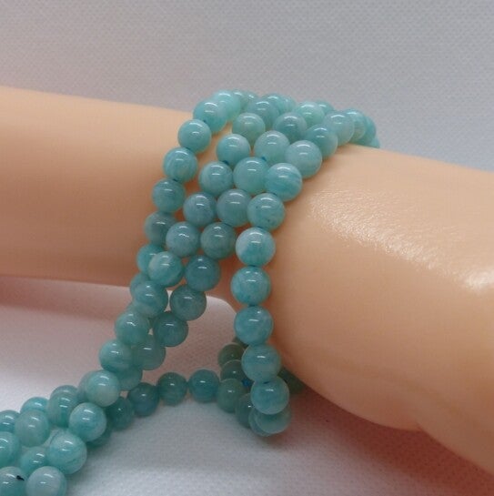 Le fil de perles en Amazonite naturelle se distingue par sa couleur vert-bleu douce et lumineuse, parfois légèrement striée ou marbrée, créant un effet élégant et apaisant.