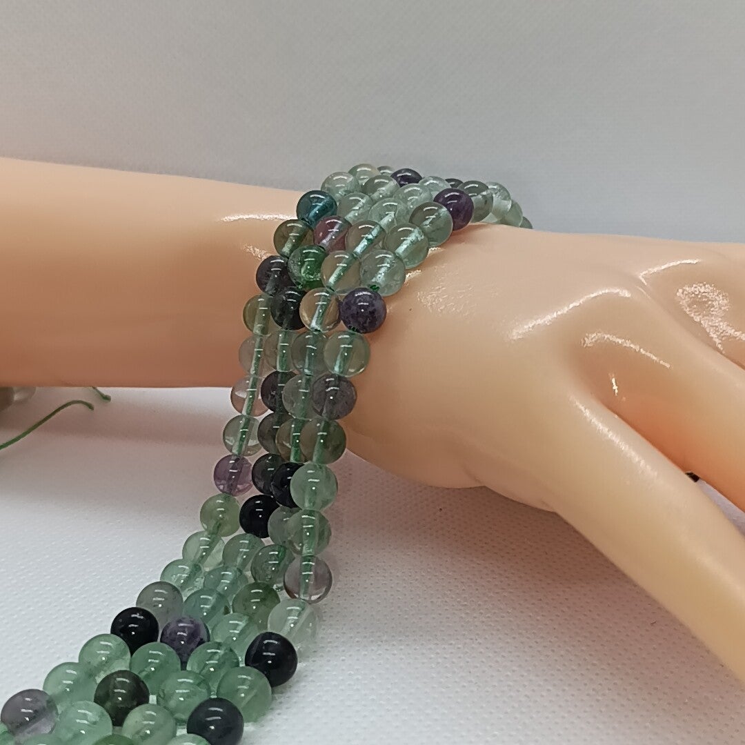 Le fil de perles en Fluorite naturelle se distingue par sa couleur multicolore unique, allant du violet au vert, parfois avec des nuances translucides, offrant un effet marbré naturel très esthétique. Un fil uniforme et harmonieux, parfait pour les créations raffinées et artisanales.