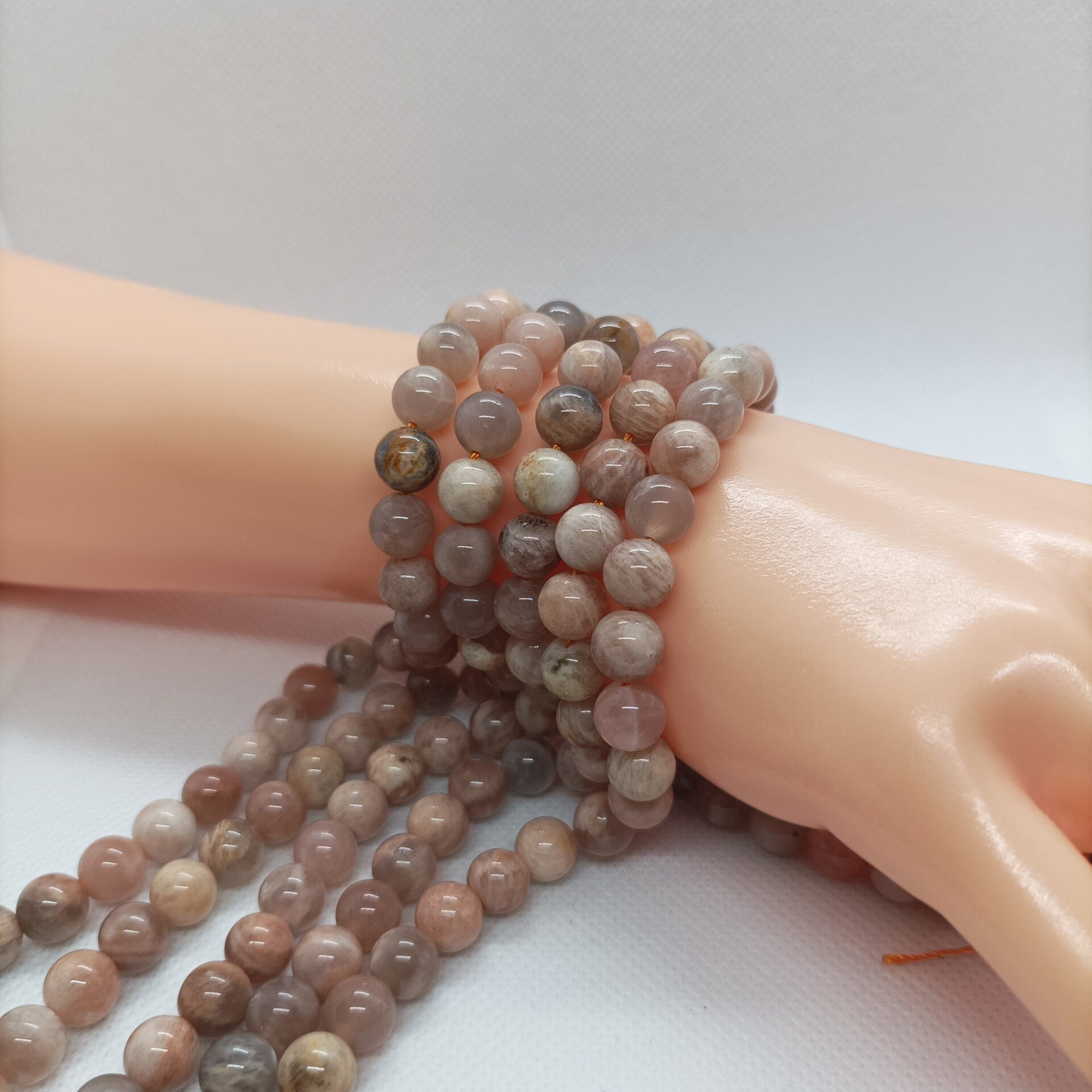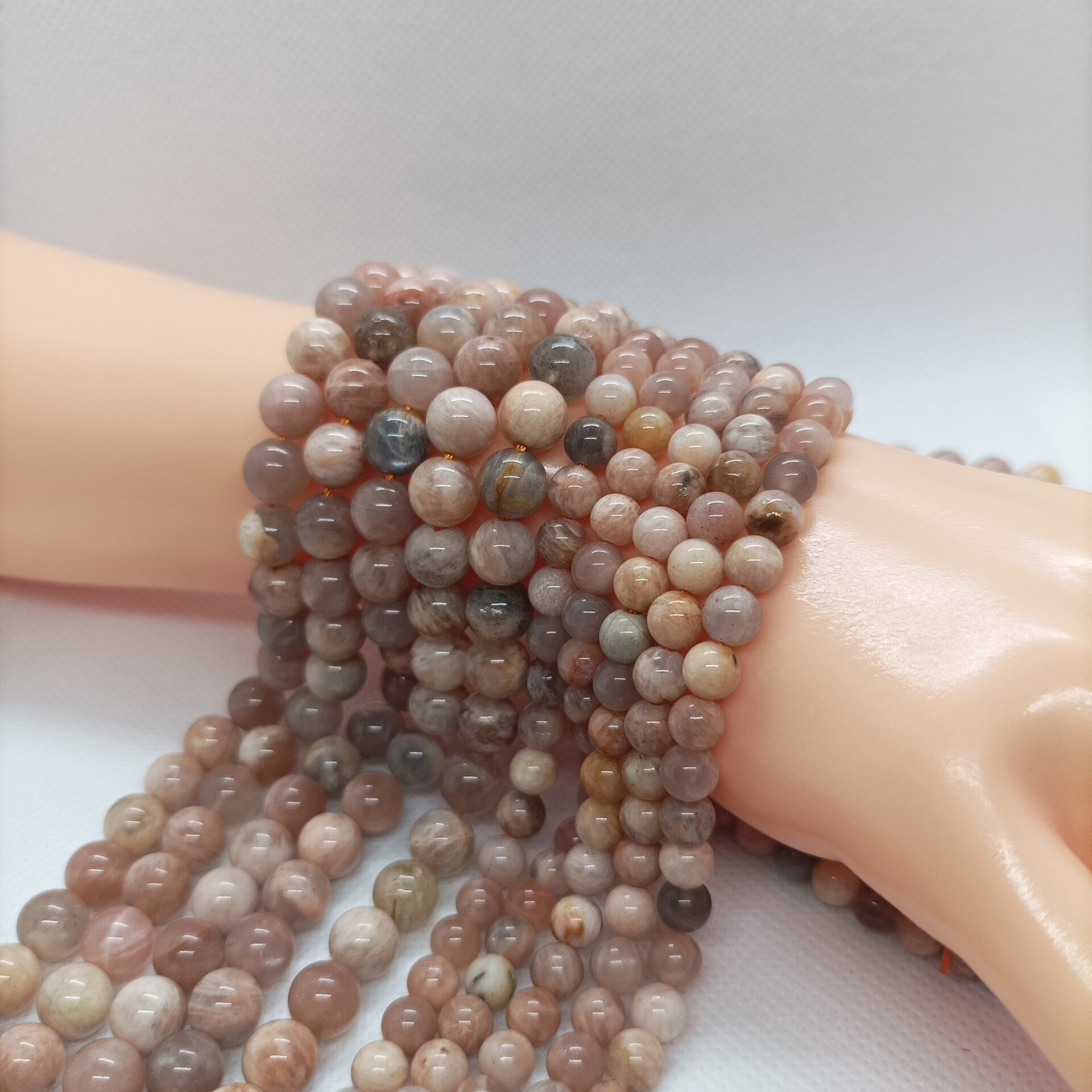 Le fil de perles en Pierre de Lune Multicolore naturelle se distingue par ses reflets lumineux irisés allant du blanc laiteux au bleu, rose ou doré selon l’angle de la lumière, offrant un rendu mystique et élégant.