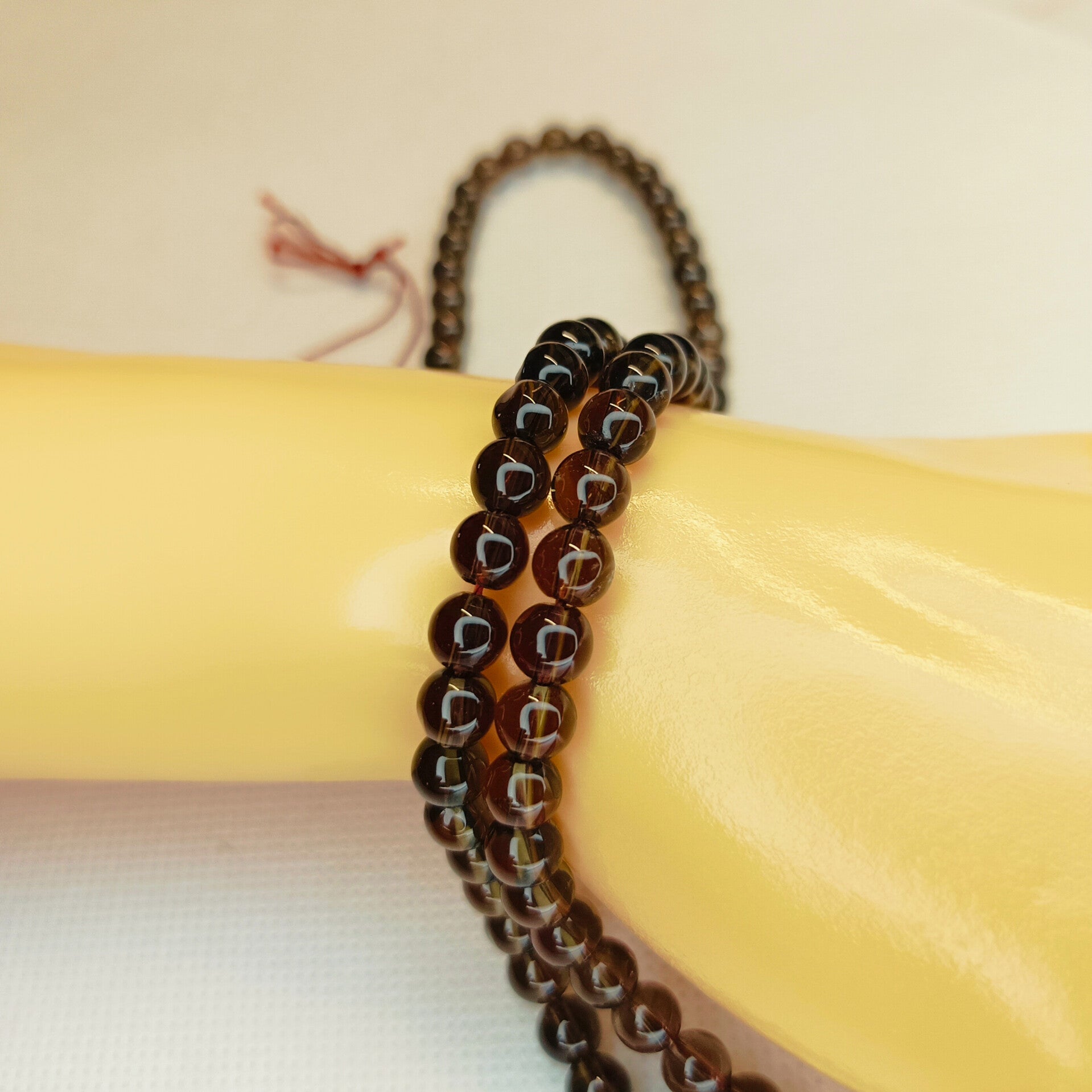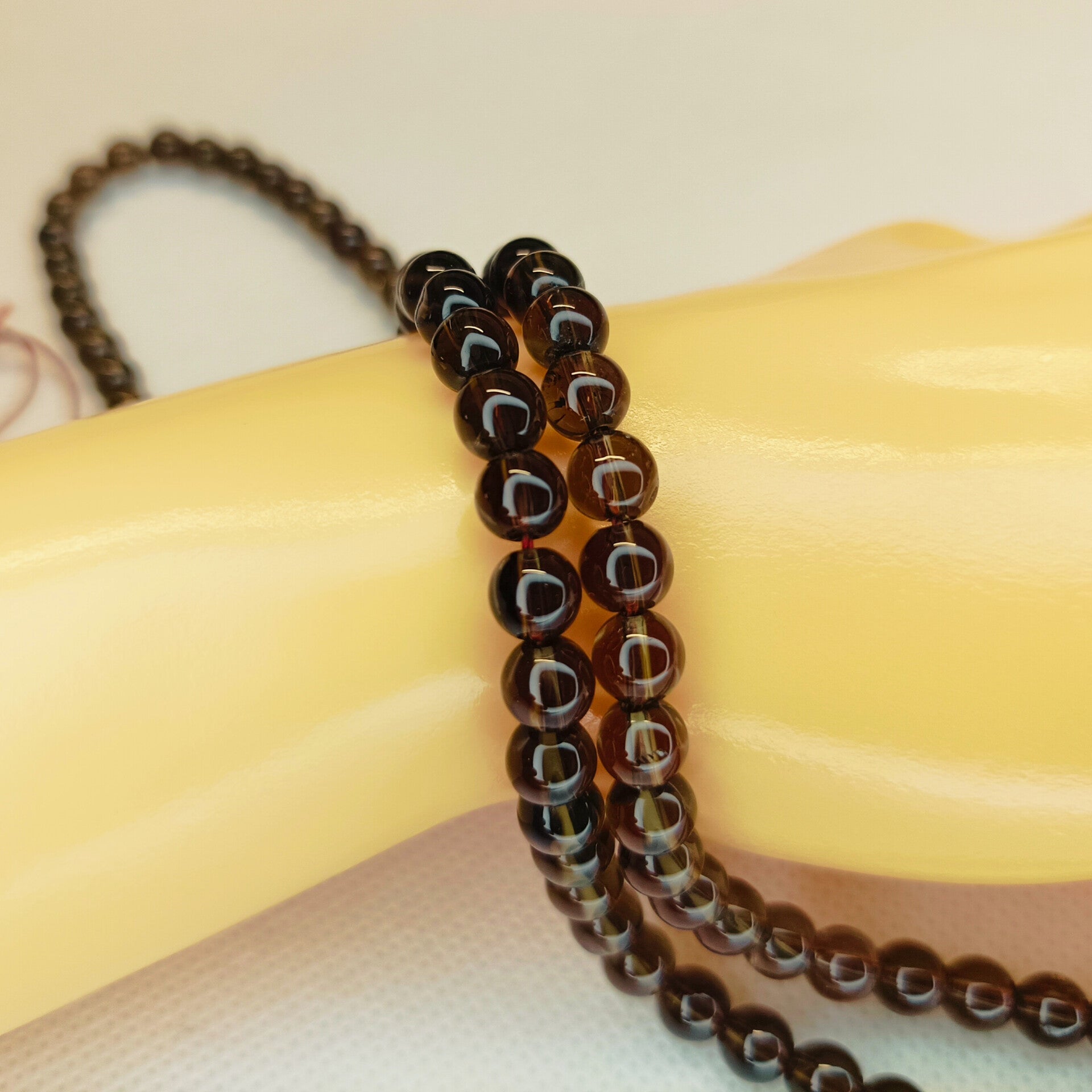 Le fil de perles en Quartz Fumé naturel se distingue par sa couleur brune translucide, allant du beige clair au brun profond, offrant un rendu élégant, sobre et chaleureux.