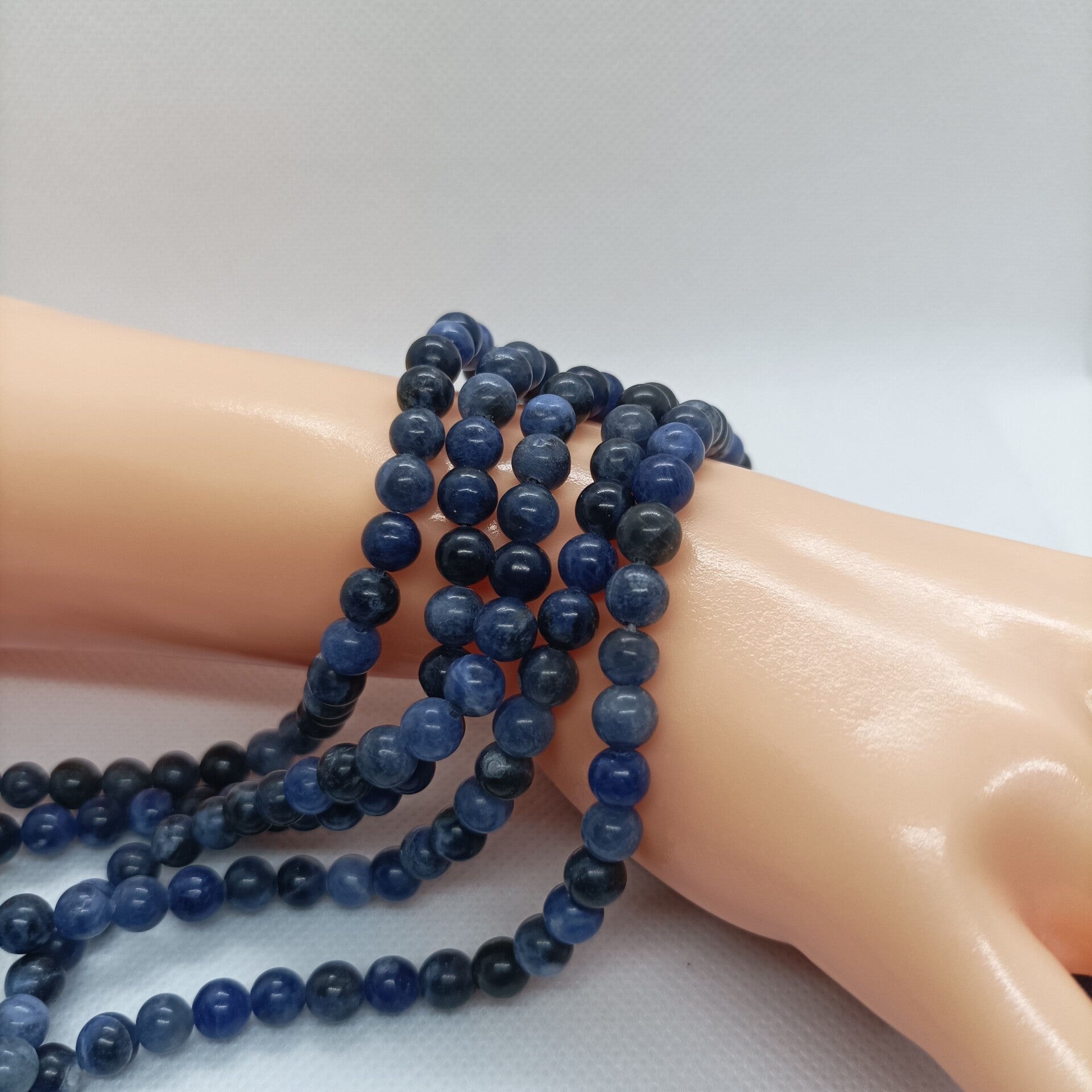 Le fil de perles en Sodalite naturelle se distingue par sa couleur bleu profond parsemée de veines blanches, offrant un rendu élégant, classique et harmonieux.
