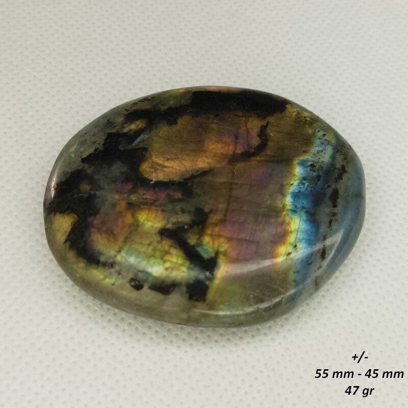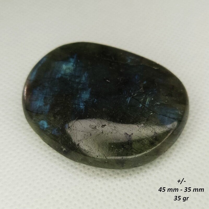 Ce galet est composé d’une Labradorite Naturelle, soigneusement façonnée pour offrir une forme plate et douce au toucher. Sa texture lisse et sa prise en main agréable en font un compagnon idéal pour la méditation ou la relaxation.