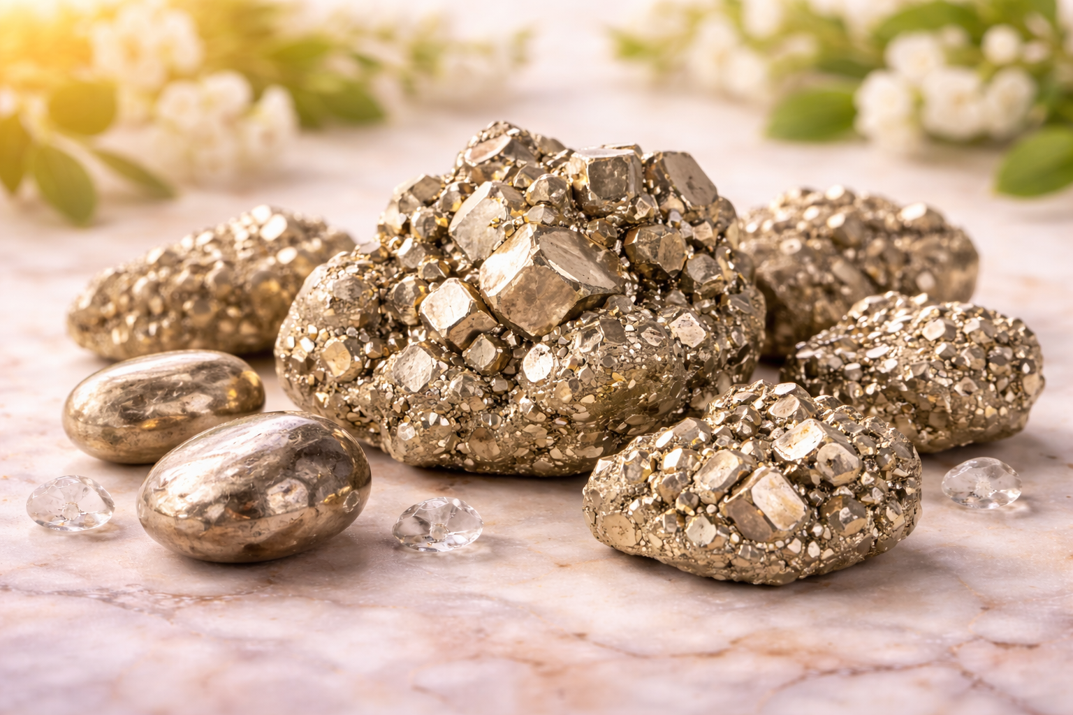 En bijoux en Pyrite (bracelets, pendentifs, pierres roulées) pour bénéficier de son énergie protectrice et stimulante